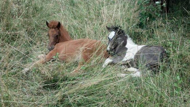 ein geschecktes Hengstfohlen von Hremsa der Fuchsstute und ein Fuchsstütchen von der braunen Stute!
